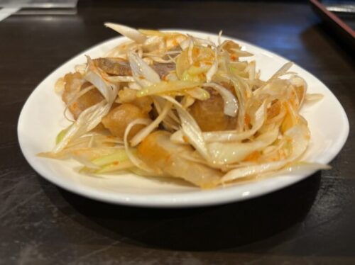白ネギに揚げた豚肉を豆板醤で絡めたうま辛な一品。