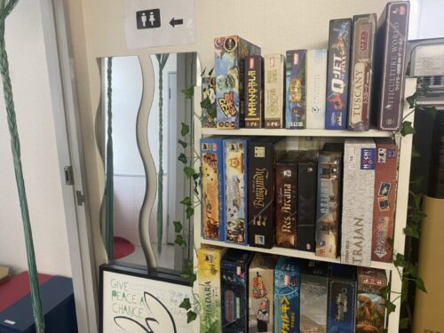 遊び終わったゲームは返却棚へ。片付け・消毒はお店が対応してくれるという手軽さもボードゲームカフェで遊ぶ際の嬉しいポイントです。