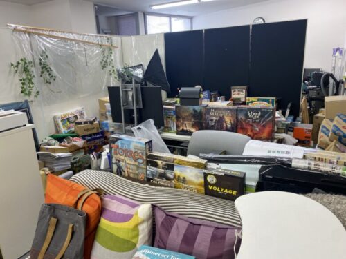 実際に遊ぶ前に店内を見渡すと、店奥にはこれから表に並ぶ仕入れたボードゲームが山のようにあります。店長の山田さんは2020年に初めてボードゲームに触れるまではジェンガや人生ゲームぐらいしか遊んでいなかったのに、それからボードゲームの購入を始めて今では県内最大のゲーム数を誇るボードゲームカフェになったのですから人生ってどう転ぶか分からないものですね…!
