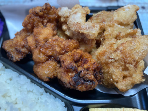 こちらは唐揚げは塩と醤油が1個ずつ。加えて様々なおかずが入っています。こちらも塩と醤油の2種の唐揚げを愉しめるのが嬉しい。