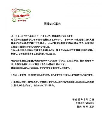 今現在地元のお店でも人員確保には非常に苦心しているという話は聞いておりました。