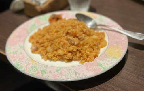 「オムライスの中身」ってイメージが強いメニューですが、手取天満宮参道の並びにあるバル「凡凡堂」というお店に、王道のチキンライスがあるというので食べにいきました。