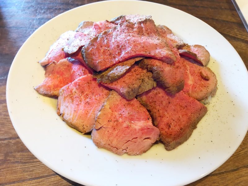 お皿いっぱいにローストビーフが乗った「BooBeef丼」!ローストビーフの下にごはんが隠れています。