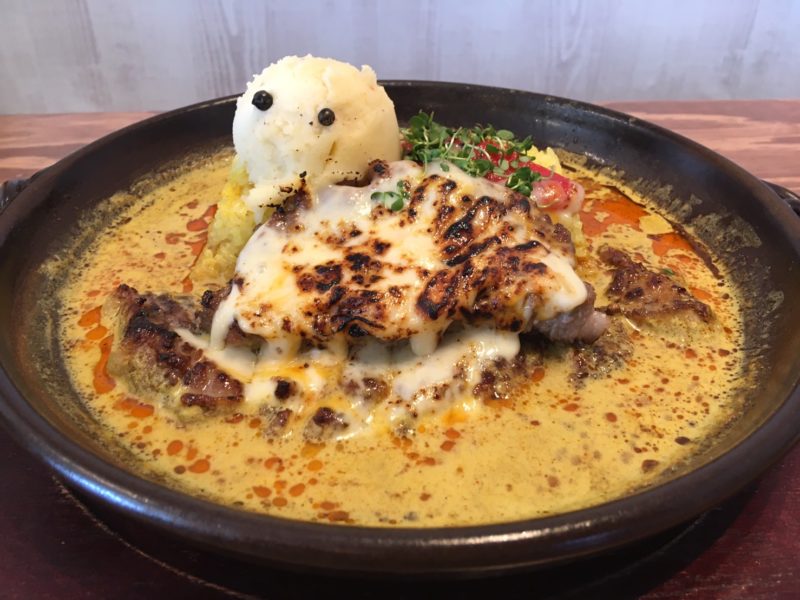 「たまには贅沢しちゃえ!」と、おすすめの豚肩ロースステーキカレーのダブル(お肉200g)に、炙りチーズとマッシュポテトのトッピングを2の中辛でオーダーしてみました。