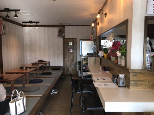 店内は、オープンキッチンを囲むL字のカウンター席とお座敷席。