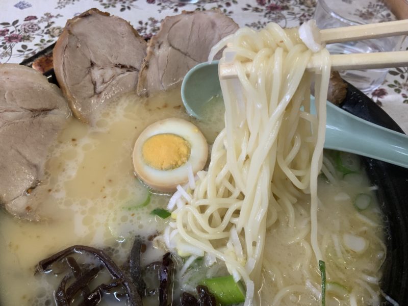 スープは熊本豚骨ながら臭みが抑えってあってあっさりしていて食べやすく、優しい味わい。