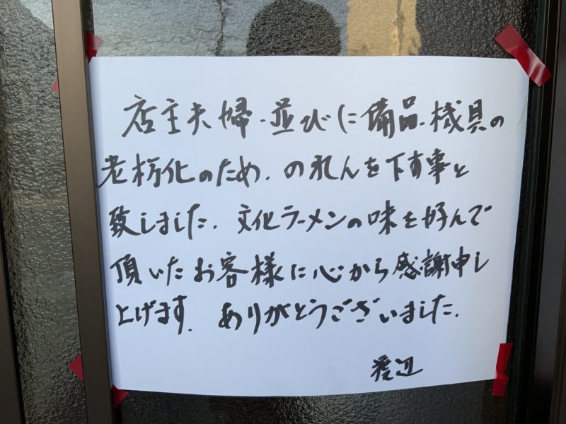 大津町のラーメン店「文化ラーメン」(旧57号沿い)が昨年末で閉店しました。県外からも多くのお客さんが訪れる人気店でしたが、店主夫妻の体力や調理器具の老朽化から閉店を決められたそうです。