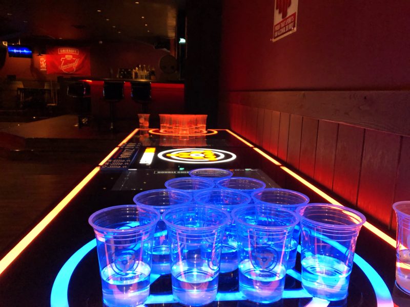 店内にはビリヤード台やダーツなどの設備、そしてこのキラキラ光るビアポン!テーブルの両端に置かれたカップにピンポン玉を投げ合うゲームなんだそうです。