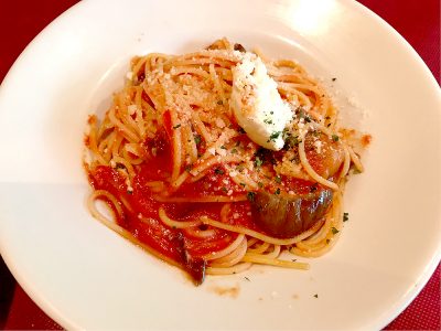 いよいよメインのパスタが運ばれてきました。この日は、「茄子とモッツァレラチーズのトマトパスタ」の登場!