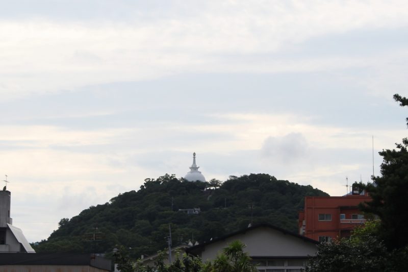 花岡山の頂上にそびえたつ仏舎利塔(ぶっしゃりとう)