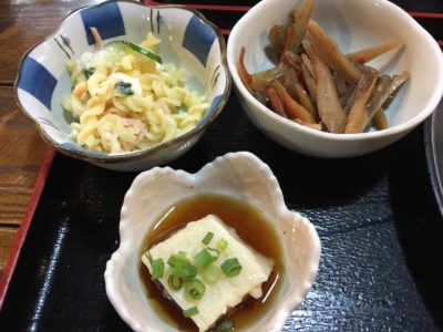 味がしっかり染みたきんぴらごぼうに、具だくさんのマカロニサラダ。白い豆腐はもちもちした食感で、尋ねてみたところ、豆乳豆腐とのこと。650円とは思えないおかずの量です!