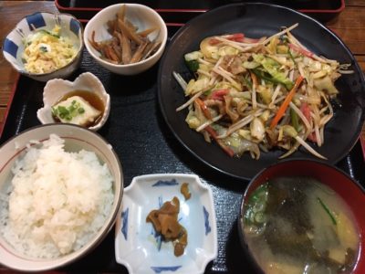 ボリュームたっぷりの野菜炒めに、ご飯、味噌汁、漬物に加え、なんと小鉢が3つもついています!