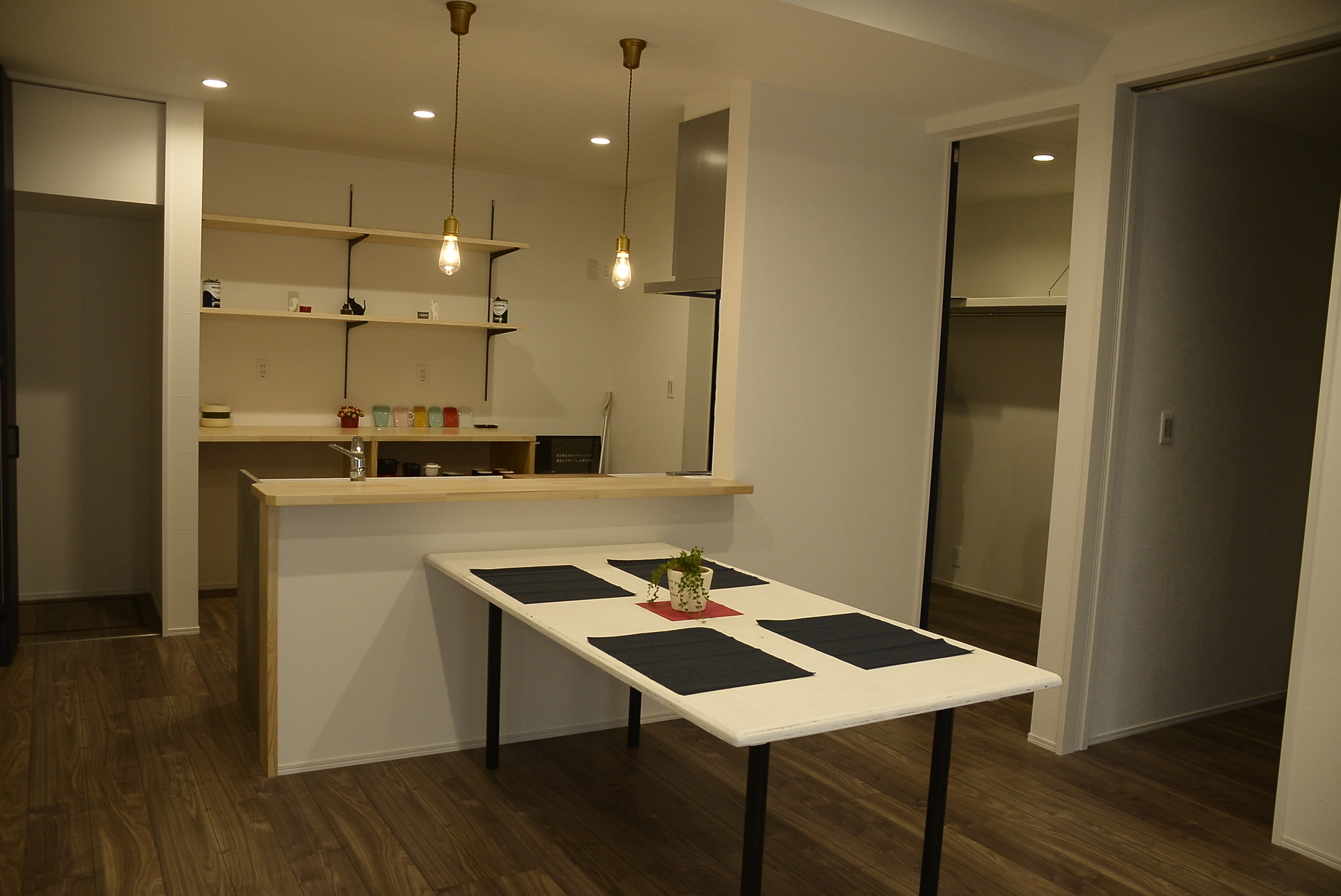 ダイニングとキッチンの奥には、回遊式の空間が出現。これは、家族全員の物が収納できるファミリークローゼット。2年~3年前は「玄関入ったらウォークインクローゼット」が流行りだったんですが、最近は「用途を設けずとにかく家族分収納できる場所」であるファミリークローゼットが主流になりつつあります。