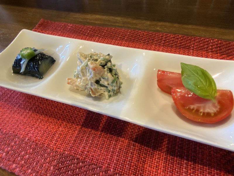 この日のお通しは、3種類の野菜料理。ナスのおひたしをはじめ、お出汁にはお向かいにある鰹節屋さん「松魚村平」で削りたてのものを使っているそうです。塩トマトももちろん熊本県産。