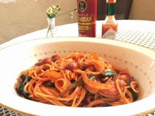 ナポリタンを頼んでみましたが、具だくさんで、ウインナーや玉ねぎ、ピーマンのほか、ほうれん草も入っていました。