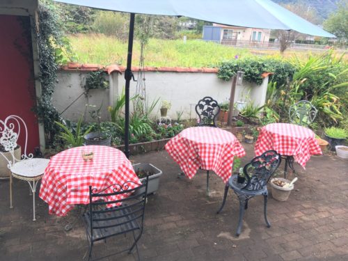 緑の空間に、赤いチェックのテーブルクロスが映えます。