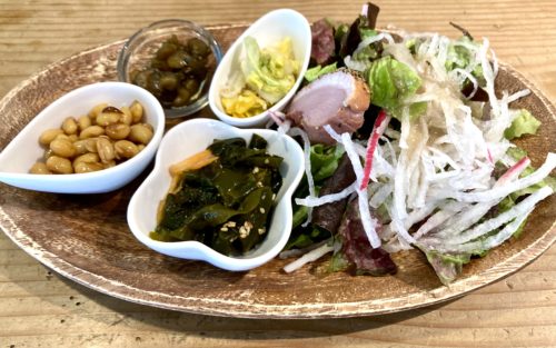まず前菜がきました。全部美味しかったのですが、特に美味しかったのが熊本の郷土料理、ざぜん豆!味が染みていて箸が止まりませんでした。サラダも新鮮で美味。前菜から食べ応えがありました。