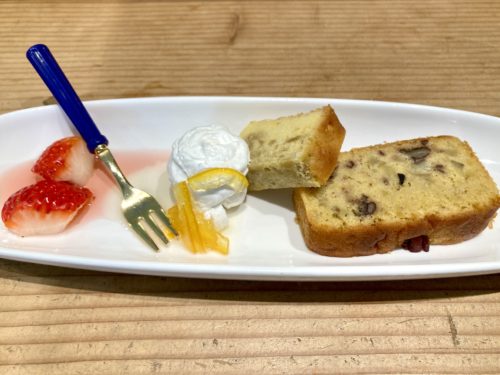 最後にデザート。ペーストした栗、カットした栗2種のケーキです。それぞれ食感が違って面白い!いちごジャムのシロップを添えた苺、甘夏マーマレードも添えられていて最後まで満足の内容でした。コーヒーも付いて1000円です。内容は日替わりで、予約は受け付けていないそうです。