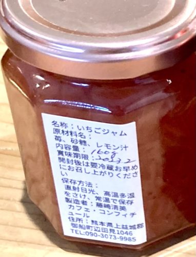 きよみさんの作るジャムは、添加物は一切使用せず、材料は果実・砂糖・レモン汁のみ!いちごジャムのラベルを見てもこの通り。果実も入手困難な果実以外98%熊本県産のものを使用しているので安心安全です。きよみさんの手で収穫しているので果物の育ち処も教えてくれますよ!