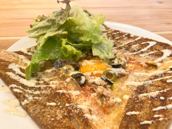 ニース風ガレットに入っているオリーブやツナ、チーズの塩味がたまりません!