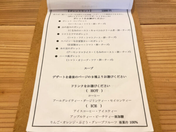 ガレットは6種類。セットでは、ガレットの他にドリンクとデザートが選べます。