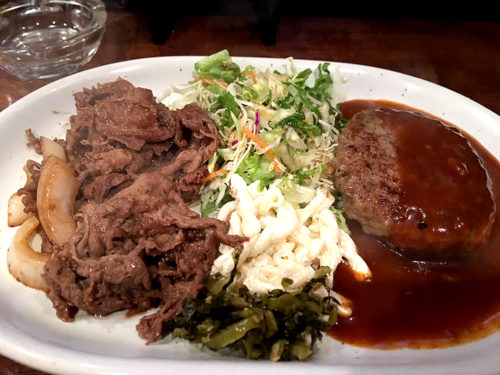 焼肉とハンバーグの夢のコラボ!その間を野菜とマカロニのサラダで仕切っています。そのどちらも普通サイズなので、ボリュームも満点。