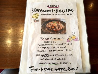 お店では、常に季節の期間限定メニューを準備しているそうで、いまは「河野さんちのいきなりピザ」というピザが!