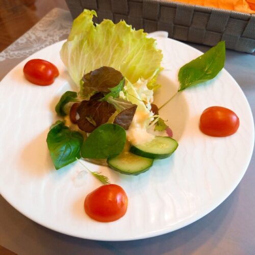 サラダのドレッシングはコーンソースでほんのり甘く、庭でとれたバジルはしゃっきりさわやか!
