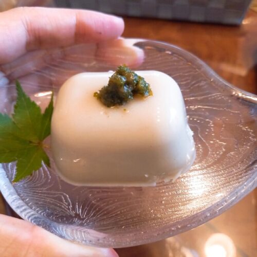 自家製ゴマ豆腐にシソの葉の佃煮がのってるこちら、醤油要らず!