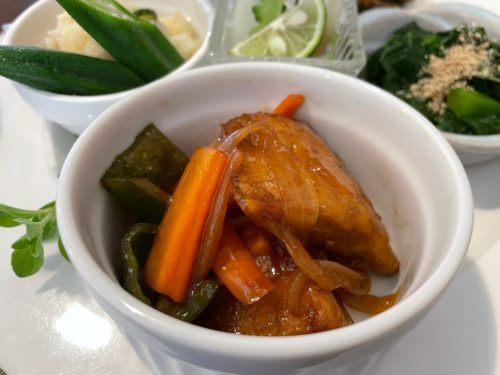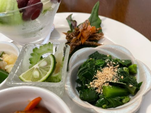 モロヘイヤとツルムラサキの和え物や、ごぼうをしっかりと炒めたきんぴらごぼう、ゴーヤと瓜の漬物など、体の全細胞が喜ぶような、栄養たっぷりのおかずがいっぱい!野菜も無農薬野菜が使われているので、安心して食事をすることができます。