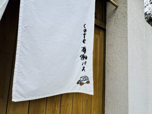 「Cafe 有働バス」と可愛い刺繍がされた、真っ白な暖簾にときめきます。