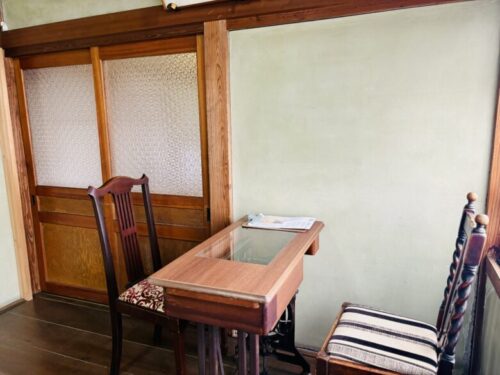 先程の広いスペースとは別のお部屋のお席に座りました。こちらはおばあさまの代からあるミシン台をリメイクされたもの。古いものに囲まれているけれど、新しい。全てが新しく命を貰って輝いているようです。