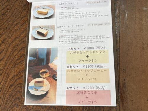 メニューはチーズケーキとドリンクのケーキセットになります。チーズケーキは2種類。