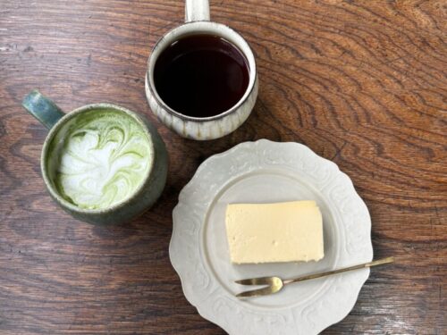 抹茶ラテは甘さ控えめな本格的お抹茶の香りを残したもの。チーズケーキと合わせても甘くなりすぎない計算がされており、感激しました。