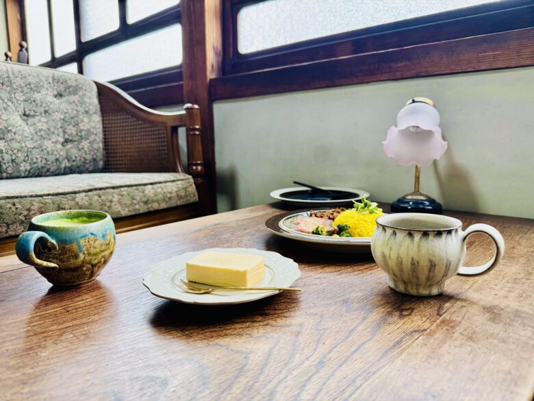 廊下から扉を開けると、素敵なカフェスペースが広がっています。全てのお席の椅子やテーブルが一つ一つ違って、センスが光ります。カリモクの椅子などが、畳のお部屋に映えておりました。