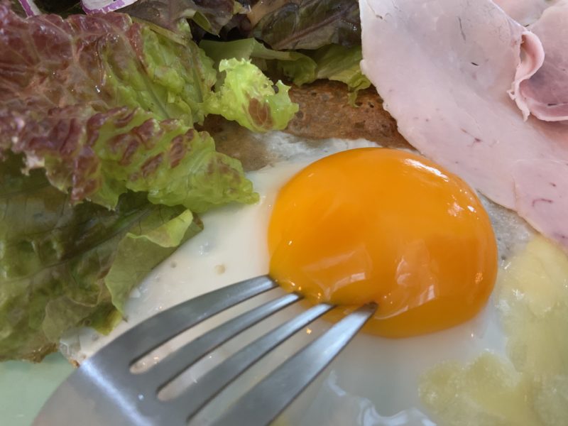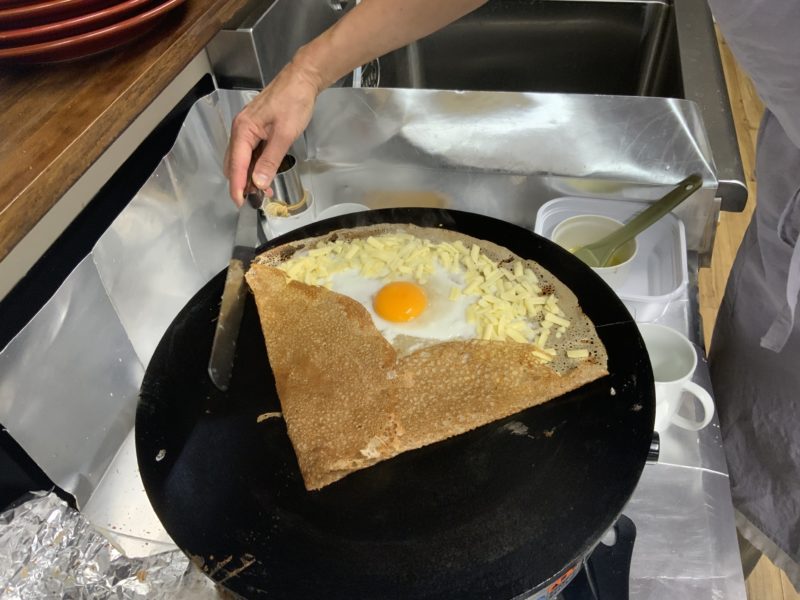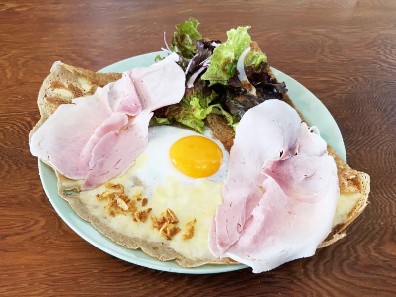 そば粉で作った記事をクレープのように焼いて、卵やチーズを乗せてさらに焼き上げ、最後に野菜とハムを乗せたらガレットの完成。