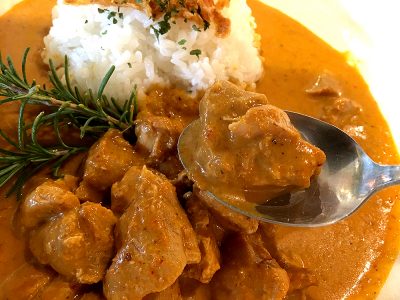 このカレーの大きな特徴は、牛乳を一切使用せず、代わりに豆乳を使っているとのこと。