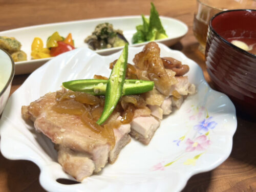 本日のメインメニューは、たっぷりの玉ねぎをじっくり炒めて素材本来の甘さを活かした「玉ねぎの照り焼きチキン」。