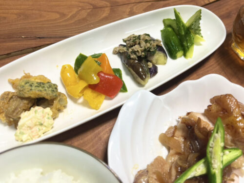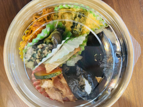 揚げナス、鮭、カボチャ、人参のかき揚げ、玉ねぎチキン、ゴーヤの南蛮漬けなどが彩り鮮やかに入っていました。旬の野菜や満載です!