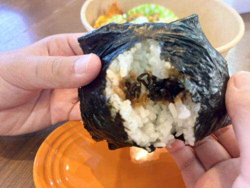 こちらのおにぎりの具材は「梅」。手作りのすっぱい梅で塩味が効いていて最高に美味でした!