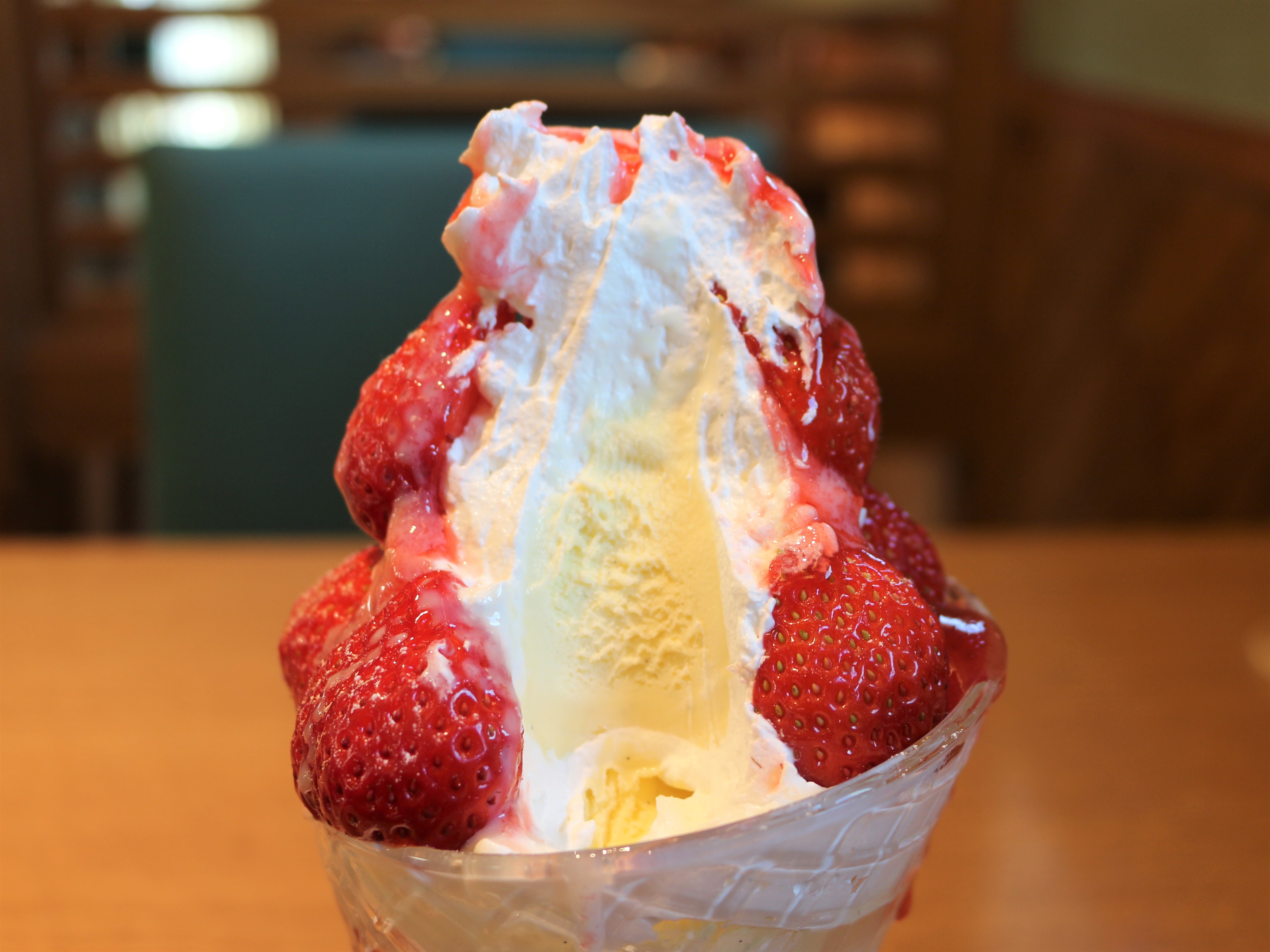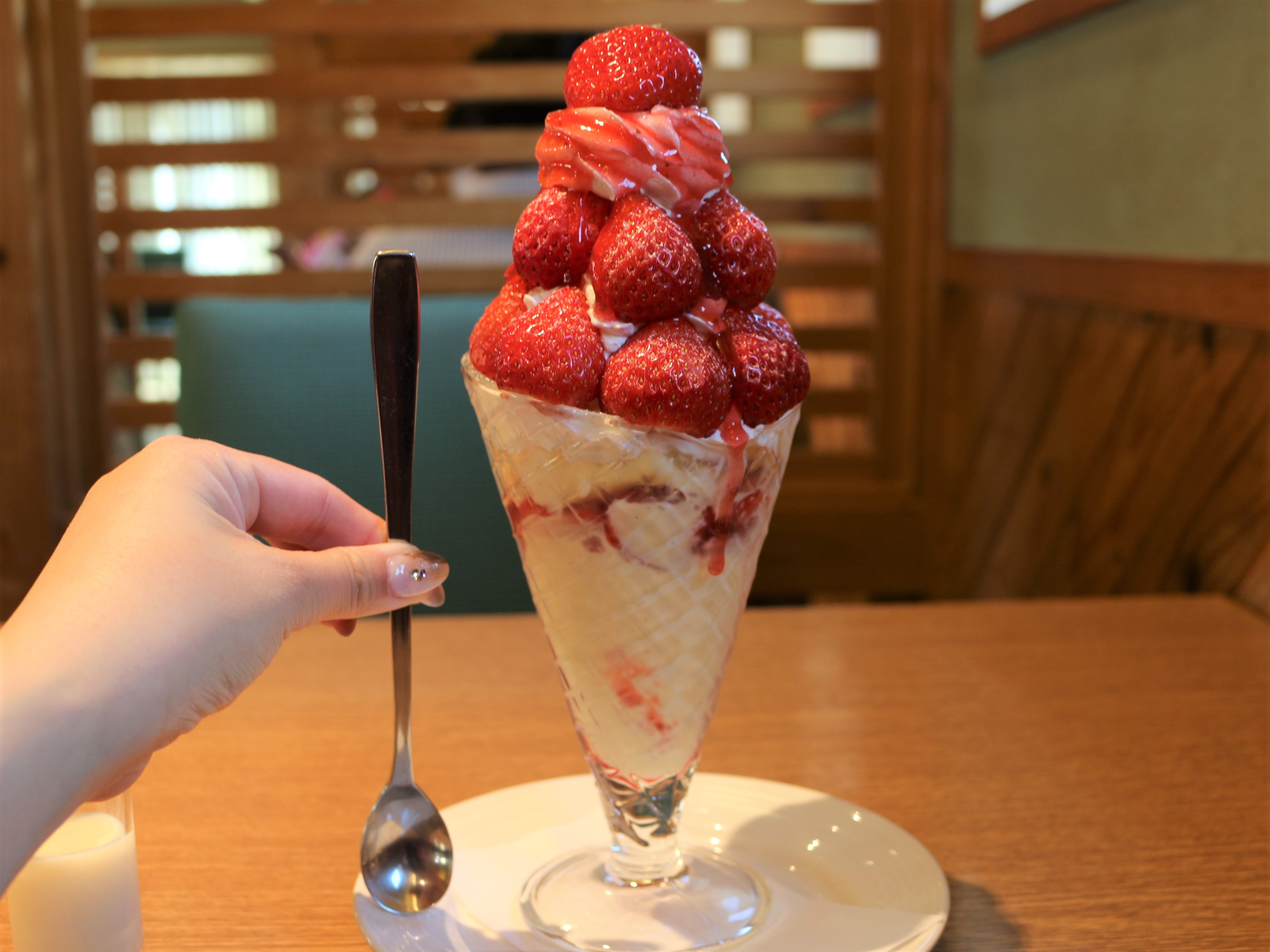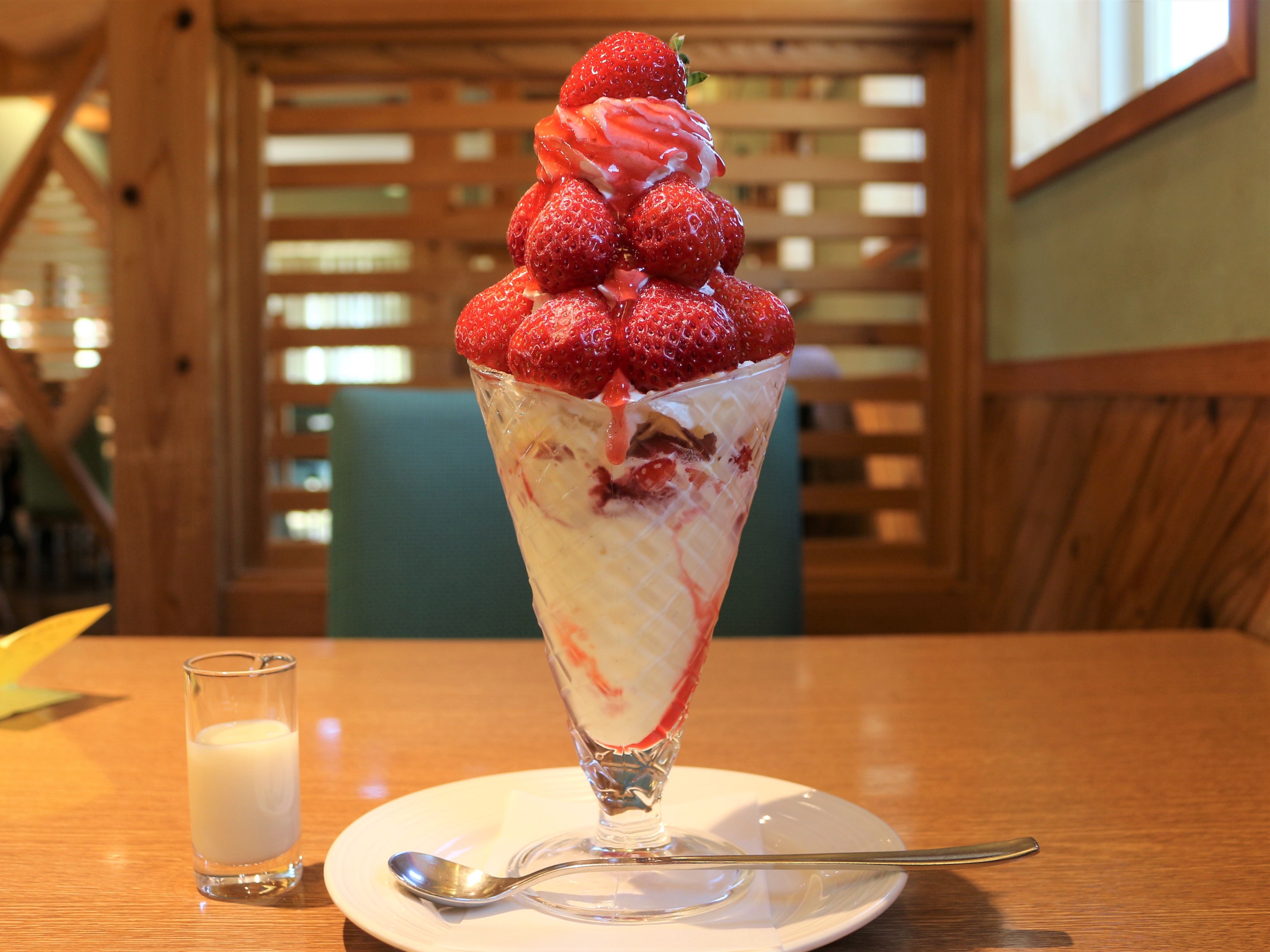 大きなパフェにはいちごもクリームもバニラアイスもぎっしり!