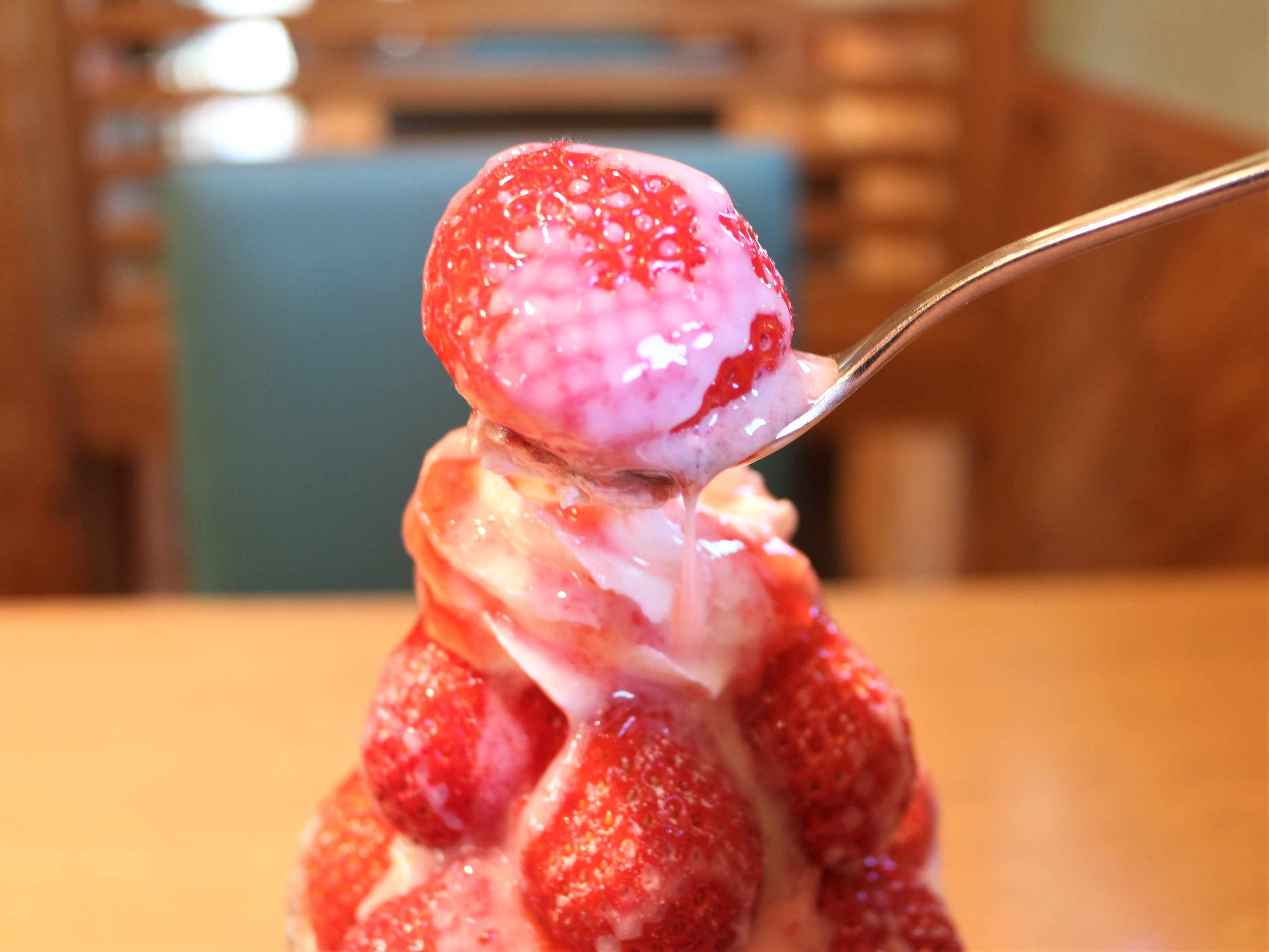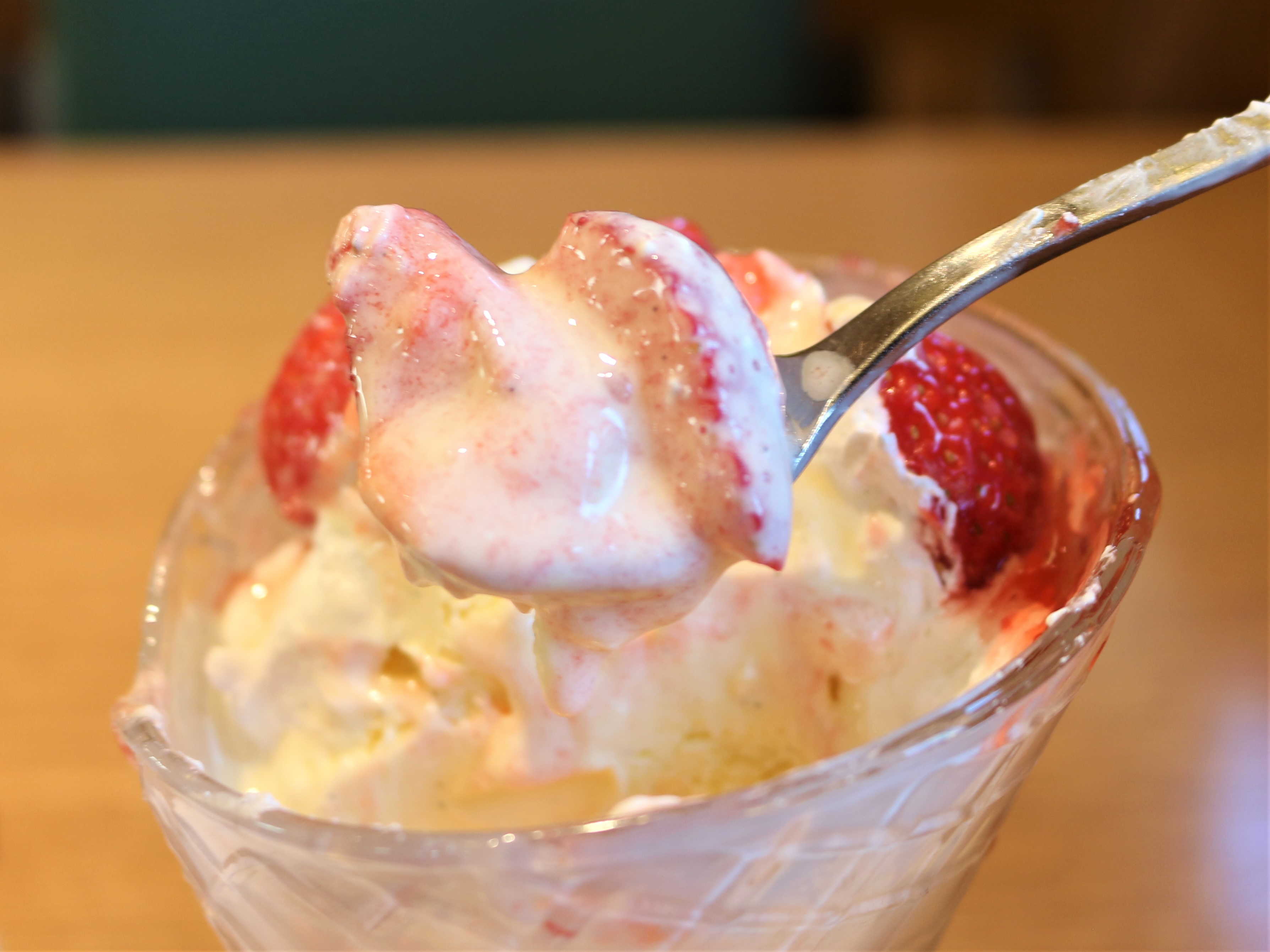 パフェ用の長ーいスプーンと比べるとこんな感じです。めっちゃ大きいです。いちごが溢れそう。