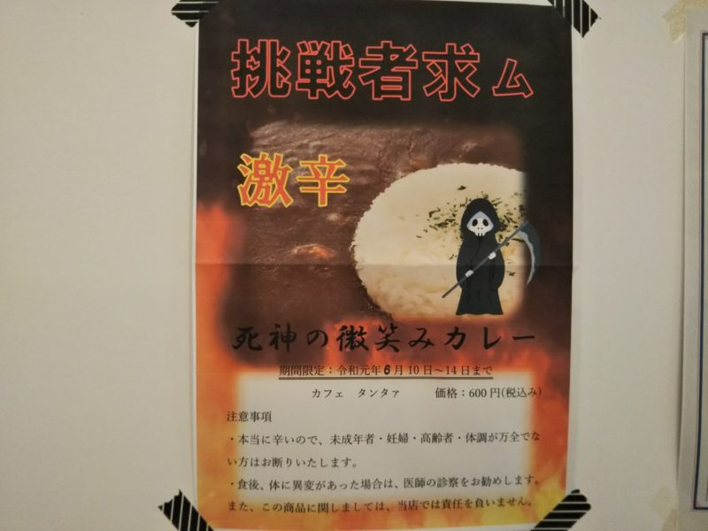 山鹿にある「カフェ タンタァ」の店頭に期間限定カレーの張り紙を見つけました。その名も「死神の微笑みカレー」…。