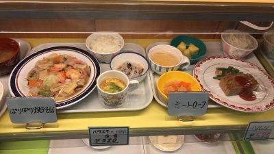 日替り定食は他にもバラエティー定食とヘルシー定食がありました。この日は、ぱりぱり焼きそばとミートローフでした。