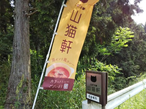 アスペクタ南阿蘇近くの山道を走っていると、「カフェ山猫軒」の幟(のぼり)と看板を発見。なにやら「南インド風カレー」と書いてあります。山奥の山猫軒…どんなお店なんだろう。