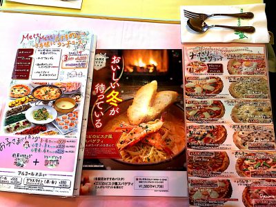 こちらがメニューです。メイン料理を選ぶと全商品に前菜ブッフェとフリードリンクがついてきます。