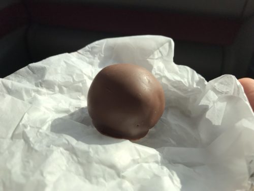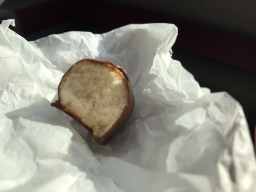 黄身餡が直接チョコでコーティングされていて、おもしろい食感と味わいです。黄身餡とはいえ、ねっとりとした感じはなく、ほろっとほどける感じで、どちらかといえば白餡に近い味でした。