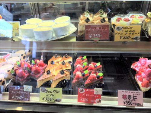 ショーケースには、プリンアラモードやティラミスといった定番商品から、オリジナルのケーキまであって、どれもおいしそう!!