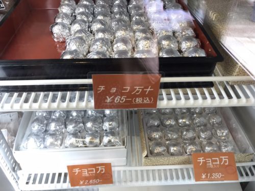 銀紙にくるまれた、小さなチョコ万十。1個65円というお手頃価格ですが、10個入り、20個入り、40個入りなどの箱詰め商品も用意されているので、ちょっとした手土産にも最適。