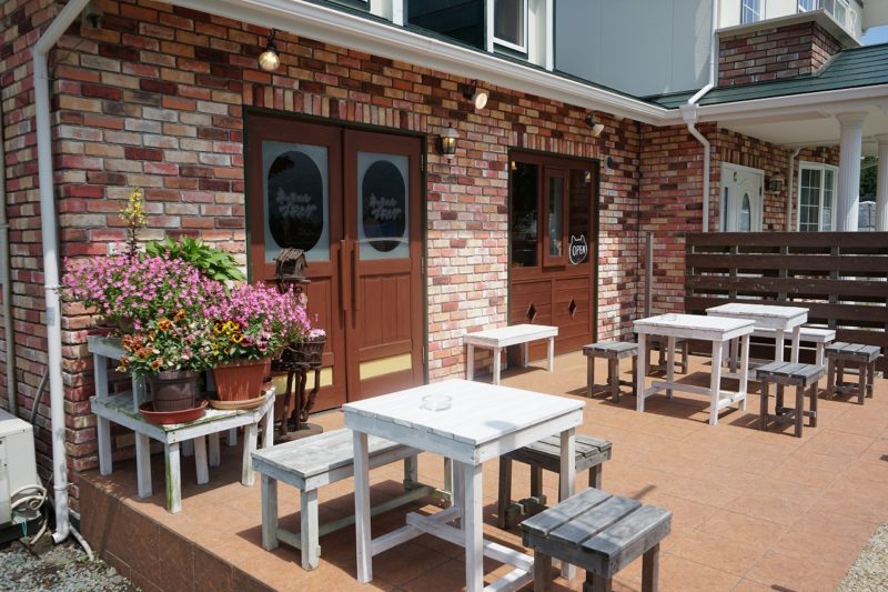 晴れた日のテラスは、南阿蘇の気持ちい風が通り抜けて気分爽快!プランターのお花を眺めながら、おやつにプリンを楽しむとか優雅すぎです。